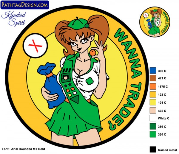 out of this one, have the adult version, gave this one to a fellow pathtag collector so let me know if you want one no way is this meant to disrespect girl scouts, this is a sticker for a skate board Sign in for more options! |